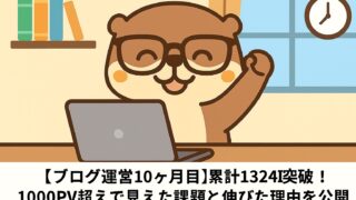 ブログ運営 【ブログ運営10ヶ月目】累計1324PV突破!1000PV超えで見えた課題と伸びた理由を公開 雑記ブログを始めて10ヶ月で累計1324PVを達成!トレンド記事や更新頻度がPV数アップにつながった理由、人気記事ランキング、今後の課題と目標を詳しくまとめています。副業ブログ運営の参考にどうぞ。 2025.10.04 ブログ運営