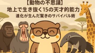 ライフスタイル 【動物の不思議】地上で生き抜く15の天才的能力|進化が生んだ驚きのサバイバル術 地上の動物たちは、それぞれに驚くべき特殊能力を持っています。シマウマの視野、ラーテルの防御力、カバの皮膚など、進化が生んだ15の“生き抜く力”を面白く紹介。読めば動物の見方が変わります! 2025.10.13 ライフスタイル