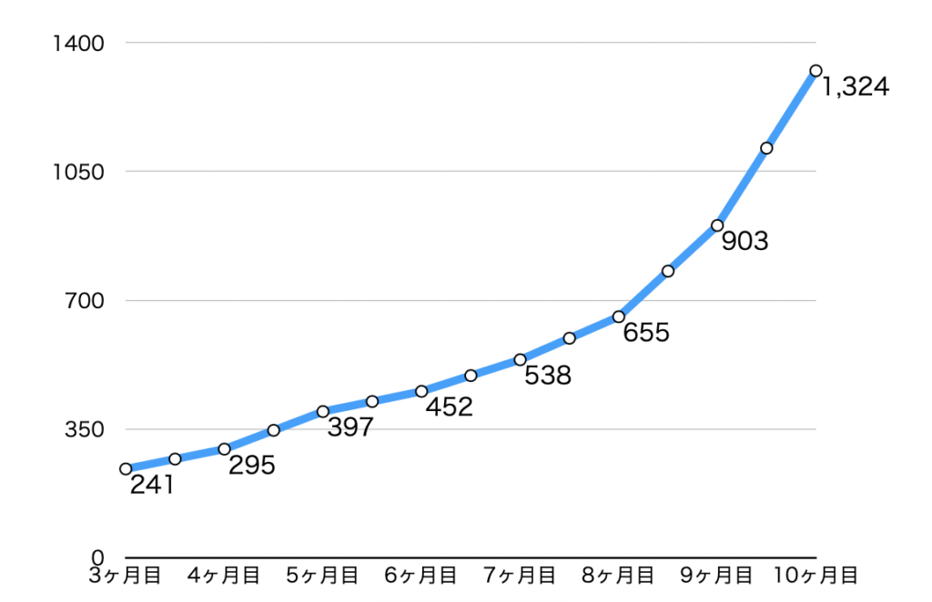 特に9ヶ月目から10ヶ月目にかけては +421PV という過去最高の伸びを記録しています。