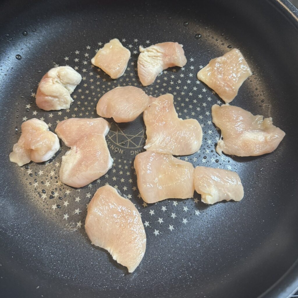 そこに鶏胸肉を広げるように並べ、まずは触らずに1分。